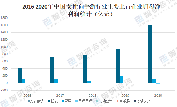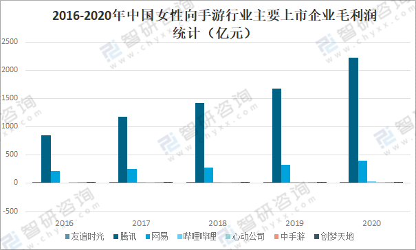 2016-2020年中國女性向手游行業主要上市企業毛利潤統計(億元)