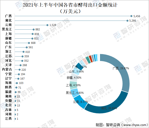 2021年上半年中國各省市酵母出口金額統(tǒng)計(萬美元)