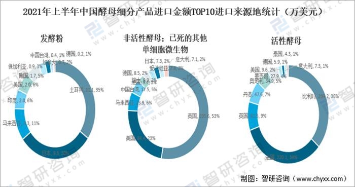 從進(jìn)口來源地來看,2021年上半年中國發(fā)酵粉主要從土耳其和日本進(jìn)口,進(jìn)口金額分別為11.1萬美元和9.5萬美元;非活性酵母;已死的其他單細(xì)胞微生物主要從英國、美國和馬來西亞進(jìn)口,進(jìn)口金額分別為195.6萬美元、84.4萬美元和23.9萬美元;活性酵母主要從比利時和法國進(jìn)口,進(jìn)口金額分別為239.2萬美元和220.1萬美元。