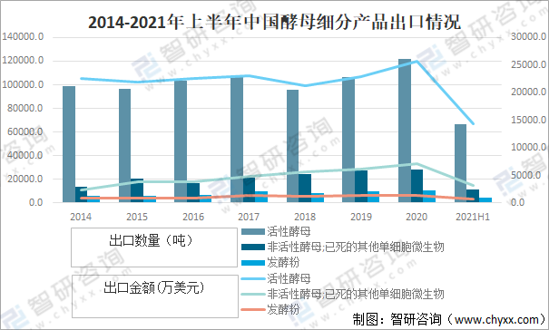 2014-2021年上半年中國酵母細(xì)分產(chǎn)品出口情況