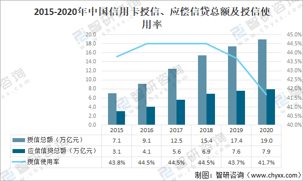 我國信用卡授信總額自2015年的7.1萬億元上升到2020年的19.0萬億元,年度復(fù)合增長率達到21.8%,信用卡應(yīng)償信貸總額亦保持著20.7%的年度復(fù)合增長率,自2015年的3.1萬億元上升到2020年的7.9萬億元。2020年中國信用卡授信使用率為41.7%。