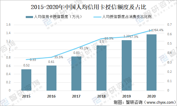 人均信用卡授信額度逐年增加,其中2020年中國人均信用卡授信額度為1.37萬元,占消費支出的64.4%。