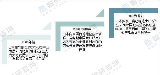 全球顯示面板產業鏈產能轉移經歷了三個時期:2000年前是有日本主導的全球TFT-LCD產業發展,同時期的韓國企業大力大力發展該產業,該時期全球出貨量第一是三星;2000-2010年日本向中國臺灣地區技術轉移,同時期中國大陸以京東方為代表的企業通過收購的方式開始快速發展液晶面板產業;