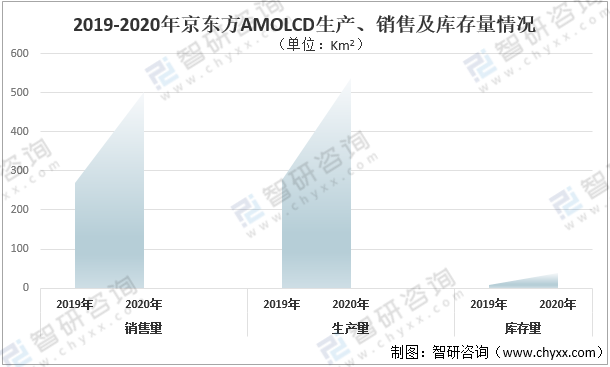 2020年京東方AMOLCD銷售量501Km2,較2019年增長232Km2;生產量537Km2,較2019年增長260Km2;庫存量40Km2,較2019年增長31Km2。