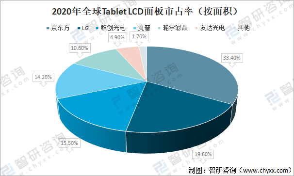 2020年,京東方占了全球TabletLCD面板的33.4%;LG占了全球TabletLCD面板的19.6%;群創光電占了全球TabletLCD面板的15.5%;夏普占了全球TabletLCD面板的14.2%;瀚宇彩晶占了全球TabletLCD面板的10.6%;友達光電占了全球TabletLCD面板的4.9%。