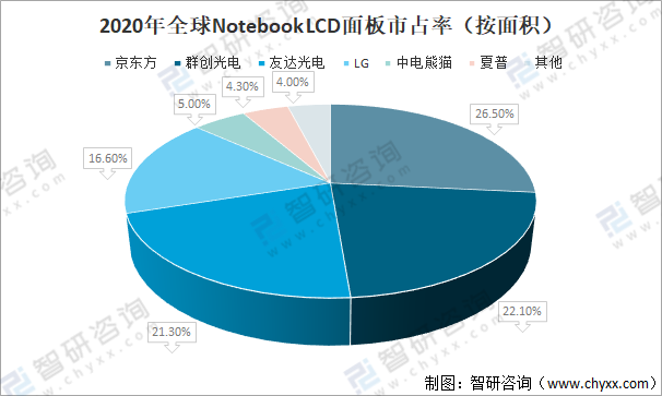 2020年全球NotebookLCD面板市占率最大的還是京東方,市占率為26.5%;第二第三分別是群創光電、友達光電,市占率分別為22.1%、21.3%,LG的市占率為16.6%,位全球第四;中電熊貓、夏普市占率分別為5.0%、4.3%。