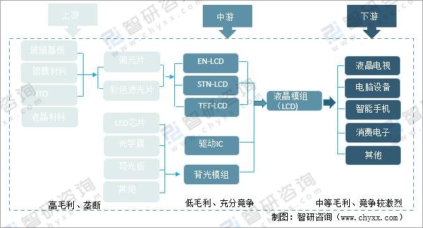 液晶面板產業鏈上游由玻璃基板、鍍膜材料、ITO、液晶材料、LED芯片、光學膜、導光板等材料;中游由EN-LCD、STN-LCD、TFT-LCD、驅動IC以及背光膜組等組成液晶模組;下游應用領域有液晶電視、電腦設備、智能手機、消費電子等。