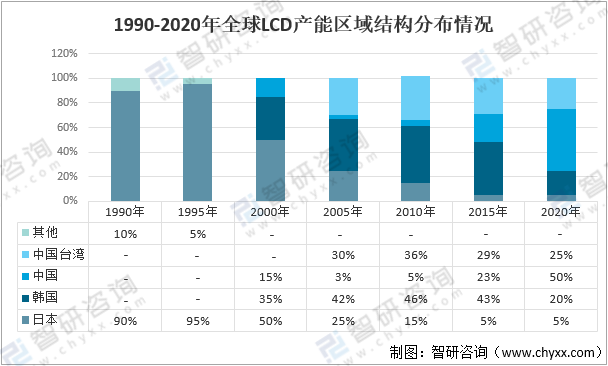 1990-2020年全球LCD產能區域結構分布情況