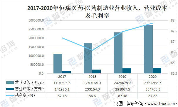 2017-2020年恒瑞醫藥-醫藥制造業營業收入、營業成本及毛利率