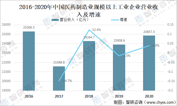 2016-2020年中國醫藥制造業規模以上工業企業營業收入及增速