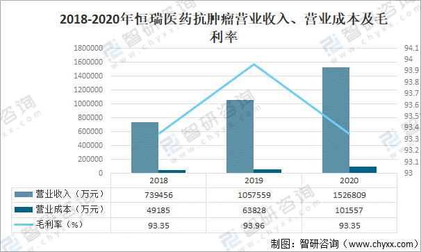 其中2020年恒瑞醫藥抗腫瘤業務營業收入為1526809萬元,同比增長44.4%;恒瑞醫藥抗腫瘤營業成本為101557萬元,同比增長59.1%;抗腫瘤業務毛利率為93.35%。