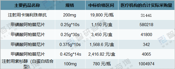 其中2020年恒瑞醫藥甲磺酸阿帕替尼片產量120萬盒,銷售113萬盒;注射用卡瑞利珠單抗產量為57萬瓶;銷售量為31萬瓶;注射用紫杉醇(白蛋白結合型)產量為200萬瓶;銷售量為180萬瓶。