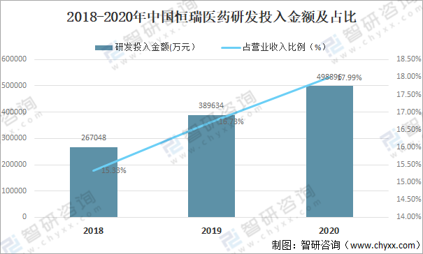 2018-2020年中國恒瑞醫藥研發投入金額及占比