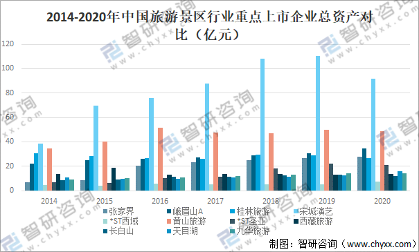 2014-2020年中國旅游景區行業重點上市企業總資產對比(億元)