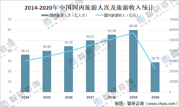 2014-2020年中國國內旅游人次及旅游收入統計