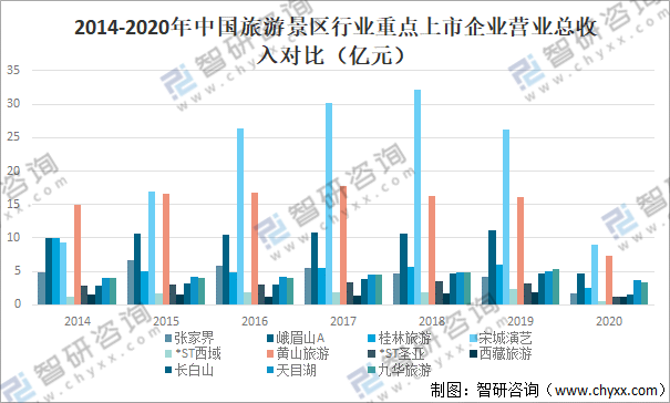 2014-2020年中國旅游景區行業重點上市企業營業總收入對比(億元)