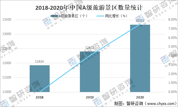 在中國遼闊的大地上,有雄偉的高原、起伏的山嶺、廣闊的平原、低緩的丘陵,還有四周群山環抱、中間低平的大小盆地,這些形態各異的地形,造就了美麗的自然風景,中國是世界四大文明古國之一,悠久的歷史文化和獨特的民族風情,具有數量多、類型全、分布廣、品位高的特點,中國旅游資源數量和品位均在全球名列前茅。截止2020年末中國共有A級旅游景區13332個,較2019年增加了930個,同比增長7.50%,其中,5A級旅游景區302個,增加22個;4A級旅游景區4030個,增加310個;3A級旅游景區6931個,增加733個。