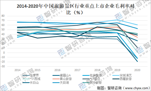 2014-2020年中國旅游景區行業重點上市企業毛利率對比(%)