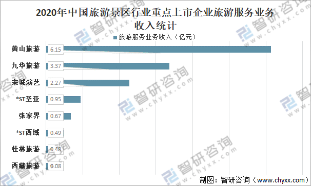 從旅游服務業務收入來看,2020年黃山旅游旅游服務業務收入為6.15億元;九華旅游旅游服務業務收入為3.37億元;宋城演藝旅游服務業務收入為2.27億元;*ST圣亞旅游服務業務收入為0.95億元;張家界旅游服務業務收入為0.67億元;*ST西域旅游服務業務收入為0.49億元;桂林旅游旅游服務業務收入為0.48億元;西藏旅游旅游服務業務收入為0.08億元。