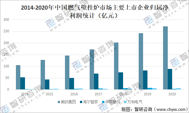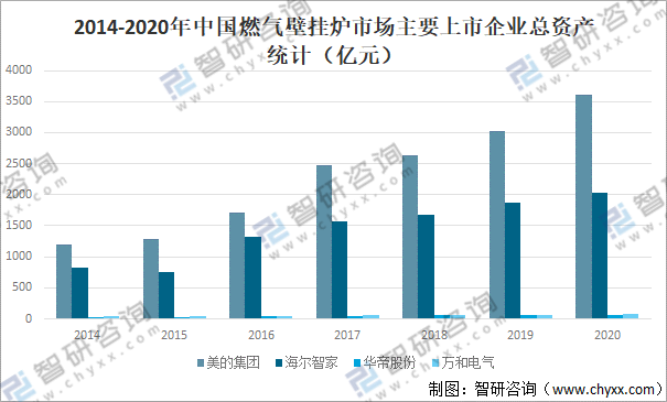 中國國內燃氣壁掛爐市場上市企業主要有美的集團、萬和電氣、海爾智家、華帝股份等。從總資產來看,除華帝股份外,2020年美的集團、萬和電氣、海爾智家總資產均保持增長趨勢。2020年美的集團總資產為3604億元,較2019年增加了584億元;海爾智家總資產為2035億元,較2019年增加了160億元;華帝股份總資產為58.43億元,較2019年減少了1.33億元;萬和電氣總資產為78.05億元,較2019年增加了8.42億元。