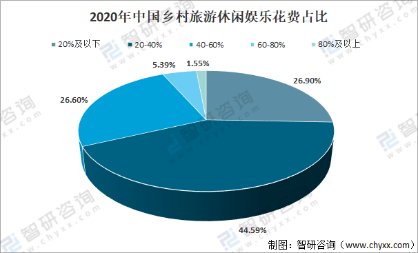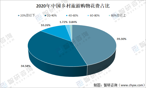 隨著人們生活條件的改善,鄉村旅游帶動農產品及手工制作。其中2020年中國鄉村旅游20%及以下花費在購物花費占比達39.3%。