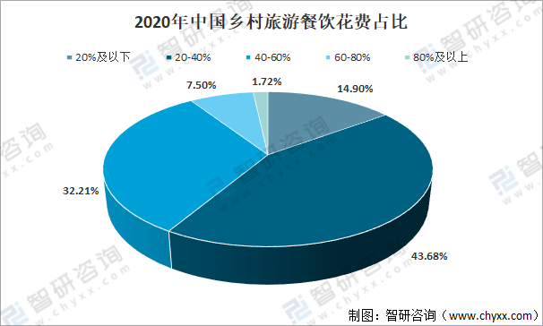 美食,輕型啟動鄉村旅游。對于鄉村而言,美食旅游可以打造地方品牌、提升旅游地吸引力、帶動多行業發展。其中2020年中國鄉村旅游花費20%及以下的花費在餐飲花費占比43.68%。