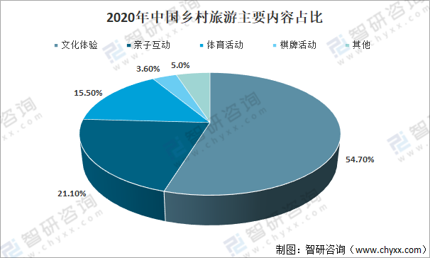 2020年中國鄉村旅游主要內容為文化體驗的占比54.7%;親子互動鄉村旅游占比21.1%;鄉村旅游體育活動占比15.5%。