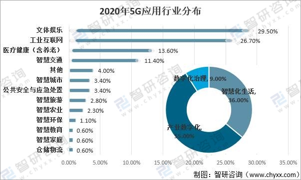 目前,5G應用已覆蓋22個國民經濟重要行業,形成許多具備商業價值的典型應用場景。文體娛樂5G應用占29.5%工業互聯網5G應用占26.7%醫療健康(含養老)5G應用占13.6%;智慧交通5G應用占11.4%;公共安全與應急處置5G應用占3.4%;智慧城市5G應用占3.4%;智慧旅游5G應用占2.8%;智慧農業5G應用占2.3%;智慧環保5G應用占1.1%;倉儲物流、智慧家庭、智慧教育5G應用各占0.6%。總的看來,產業數字化占55%;智慧化生活占36%;數字化治理占9%。