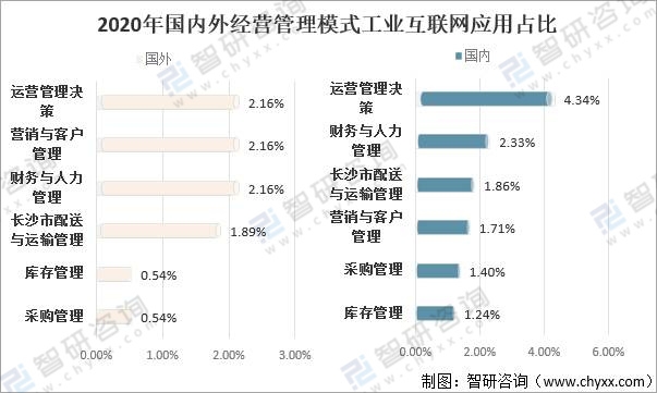 在經營管理模式工業互聯網應用來看,國內采購管理占1.40%,國外占0.54%;國內庫存管理占1.24%,國外占0.54%;國內長沙市配送與運輸管理占1.86%,國外占1.89%;國內財務與人力管理占2.33%,國外占2.16%;國內營銷與客戶管理占1.71%,國外占2.16%;國內運營管理決策占4.34%,國外占2.16%。