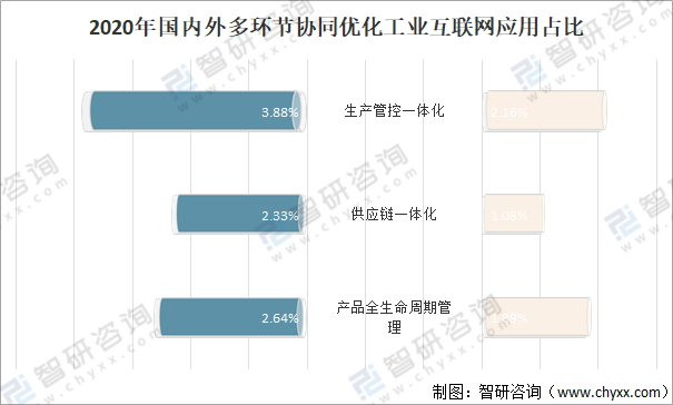 2020年國內多環節協同優化工業互聯網應用中生產管控一體化占3.88%;供應鏈一體化占2.33%;產品全生命周期管理占2.64%。國外多環節協同優化工業互聯網應用中生產管控一體化占2.16%;供應鏈一體化占1.08%;產品全生命周期管理占1.89%。