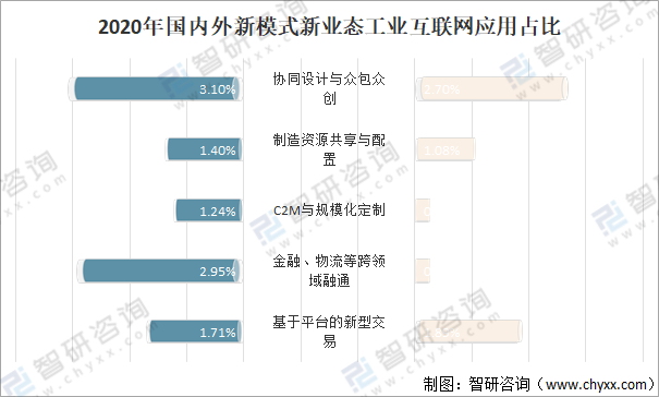 2020年國內新模式新業態工業互聯網應用中協同設計與眾包眾創、制造資源共享與配置、C2M與規模化定制、金融、物流等跨領域融通、基于平臺的新型交易分別占3.10%、1.40%、1.24%、2.95%、1.71%;國外內新模式新業態工業互聯網應用中協同設計與眾包眾創、制造資源共享與配置、C2M與規模化定制、金融、物流等跨領域融通、基于平臺的新型交易分別占2.70%、1.08%、0.27%、0.27%、1.89%。