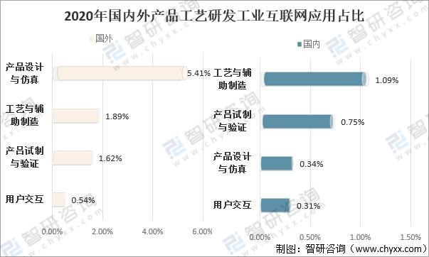 2020年產品工藝研發工業互聯網應用中國內用戶交互占0.31%,國外占 0.54%;產品設計與仿真占0.34%,國外占5.41%;產呂試制與驗證占0.75%,國外占1.62%;工藝與輔助制造占1.09%,國外占1.89%。