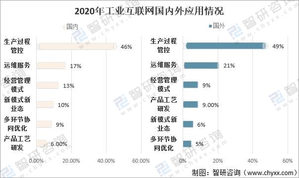 從工業互聯網國內外應用情況來看,2020年中國國內產品工藝研發領域工業互聯網應用占6.00%,國外占9.00%;生產過程管控領域工業互聯網應用占46%,國外占49%;經營管理模式領域工業互聯網應用占13%,國外占9%;運維服務領域工業互聯網應用占17%,國外占21%;多環節協同優化領域工業互聯網應用占9%,國外占5%;新模式新業態領域工業互聯網應用占10%,國外占6%,可以看出2020年生產過程管控領域工業互聯網國內外應用占比最大。
