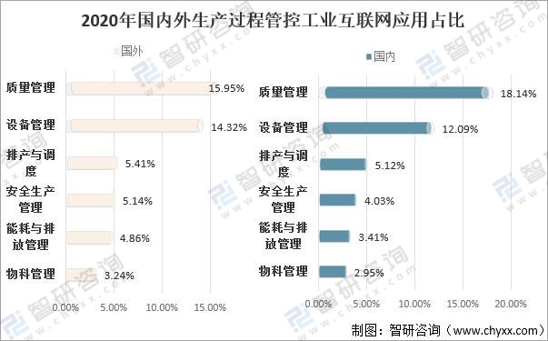 2020年國內外生產過程管控工業互聯網應用占比中質量管理占比最大,國內占18.14%,國外占15.95%;其次是設備管理,國內占12.09%,國外占14.32%;第三是生產過程管控,國內占5.12%,國外占5.41%。