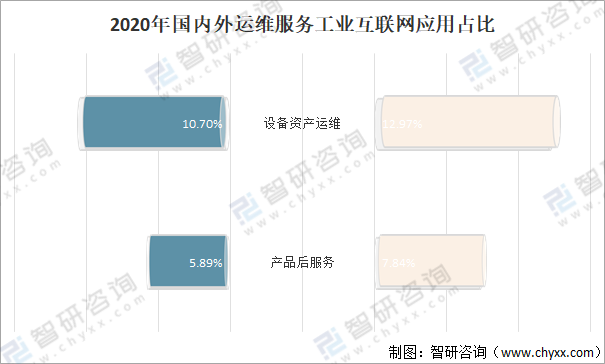 從運維服務工業互聯網應用來看,國內設備資產運維應用占10.70%,國外占12.97%;產品后服務應用占5.89%,國外占7.84%。