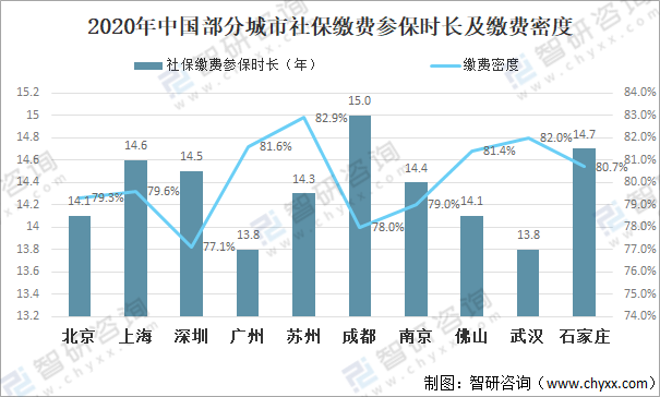 2020年中國部分城市社保繳費參保時長及繳費密度