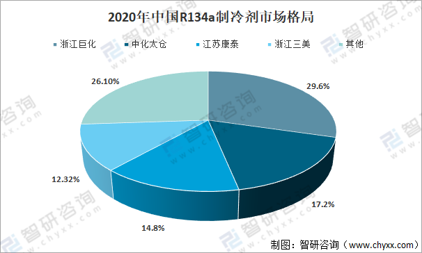 2020年R134a制冷劑市場格局中,浙江巨化占中國R134a制冷劑市場份額的29.6%;中化太倉占中國R134a制冷劑市場份額的17.2%。