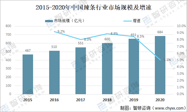 2015-2020年中國辣條行業(yè)市場規(guī)模及增速