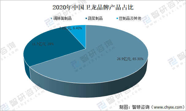 其中2020年中國衛(wèi)龍品牌產(chǎn)品中,調(diào)味面制品產(chǎn)品營業(yè)收入26.9億元,占總產(chǎn)品營業(yè)收入的65.3%;蔬菜制品產(chǎn)品營業(yè)收入為11.7億元,占總產(chǎn)品營業(yè)收入的28%;豆制品及其他產(chǎn)品營業(yè)收入為2.6億元,占總產(chǎn)品的6.4%。