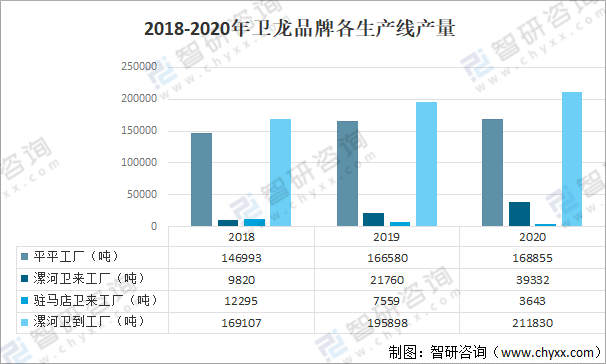 2018-2020年衛(wèi)龍品牌各生產(chǎn)線產(chǎn)量