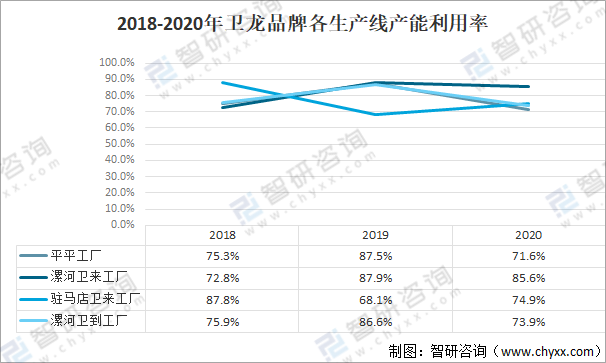 2018-2020年衛(wèi)龍品牌各生產(chǎn)線產(chǎn)能利用率