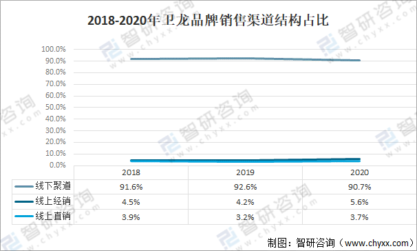 其中,2020年衛(wèi)龍品牌線下銷售渠道占比90.7%;線上經(jīng)銷商渠道占比5.6%;線上直銷渠道占比3.7%。