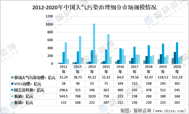 2012-2020年中國大氣污染治理細(xì)分市場規(guī)模情況