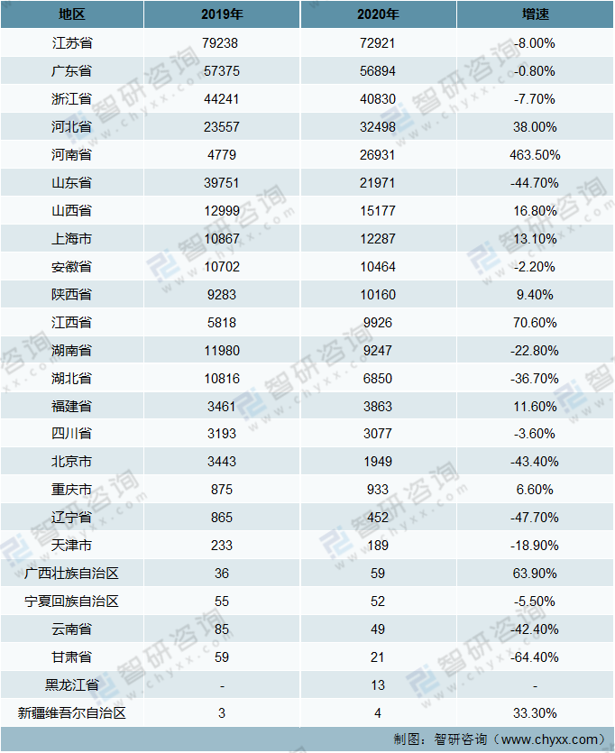 2020年大氣污染防治設(shè)備產(chǎn)量排名第一的地區(qū)為江蘇省,產(chǎn)量為72921套,較2019年的79238套同比下降8.0%;產(chǎn)量增速最快的地區(qū)為河南省,產(chǎn)量為26931套,較2019年同比增長463.5%。