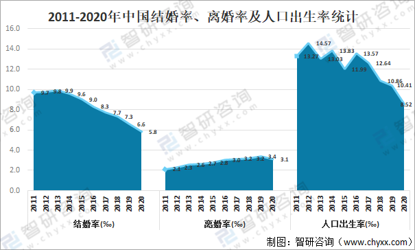 2011-2020年中國(guó)結(jié)婚率、離婚率及人口出生率統(tǒng)計(jì)