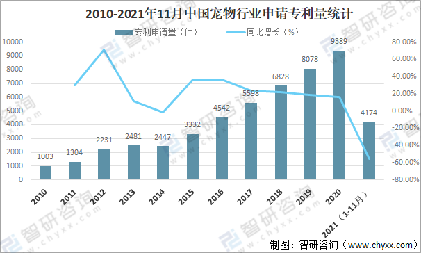 2010-2021年11月中國(guó)寵物行業(yè)申請(qǐng)專利量統(tǒng)計(jì)