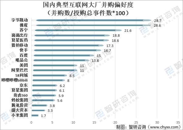 從目前國內(nèi)典型互聯(lián)網(wǎng)大廠并購偏好度來看,并購活躍度TOP20家主要互聯(lián)網(wǎng)、科技公司的并購偏好度的平均值是12.52,位于第一的是字節(jié)跳動,并購偏好度(并購數(shù)/投購總事件數(shù)*100)為28.74;位于第二的是攜程,并購偏好度(并購數(shù)/投購總事件數(shù)*100)為28.6;位于第三的是蘇寧,并購偏好度(并購數(shù)/投購總事件數(shù)*100)為21.6.