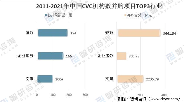 不管是在數(shù)量上還是金額上,國內(nèi)CVC收購最多的是游戲項(xiàng)目,被并購數(shù)量194起,并購金額3661.54億元;其次是企業(yè)服務(wù),被并購數(shù)量166起,并購金額僅為805.78億元;第三是文娛行業(yè),被并購數(shù)量超過100起,并購金額2235.79億元。