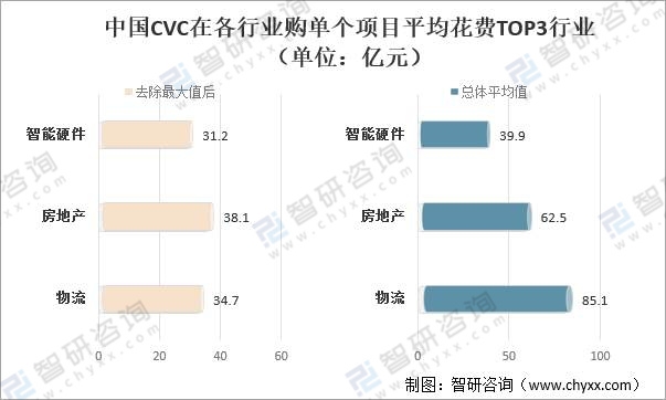 中國CVC在各行業(yè)購單個項(xiàng)目平均花費(fèi)TOP3行業(yè)(單位:億元)