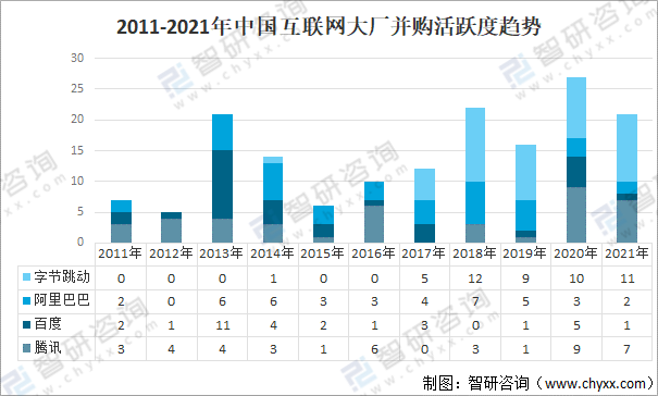 2011-2021年中國互聯(lián)網(wǎng)大廠并購活躍度趨勢